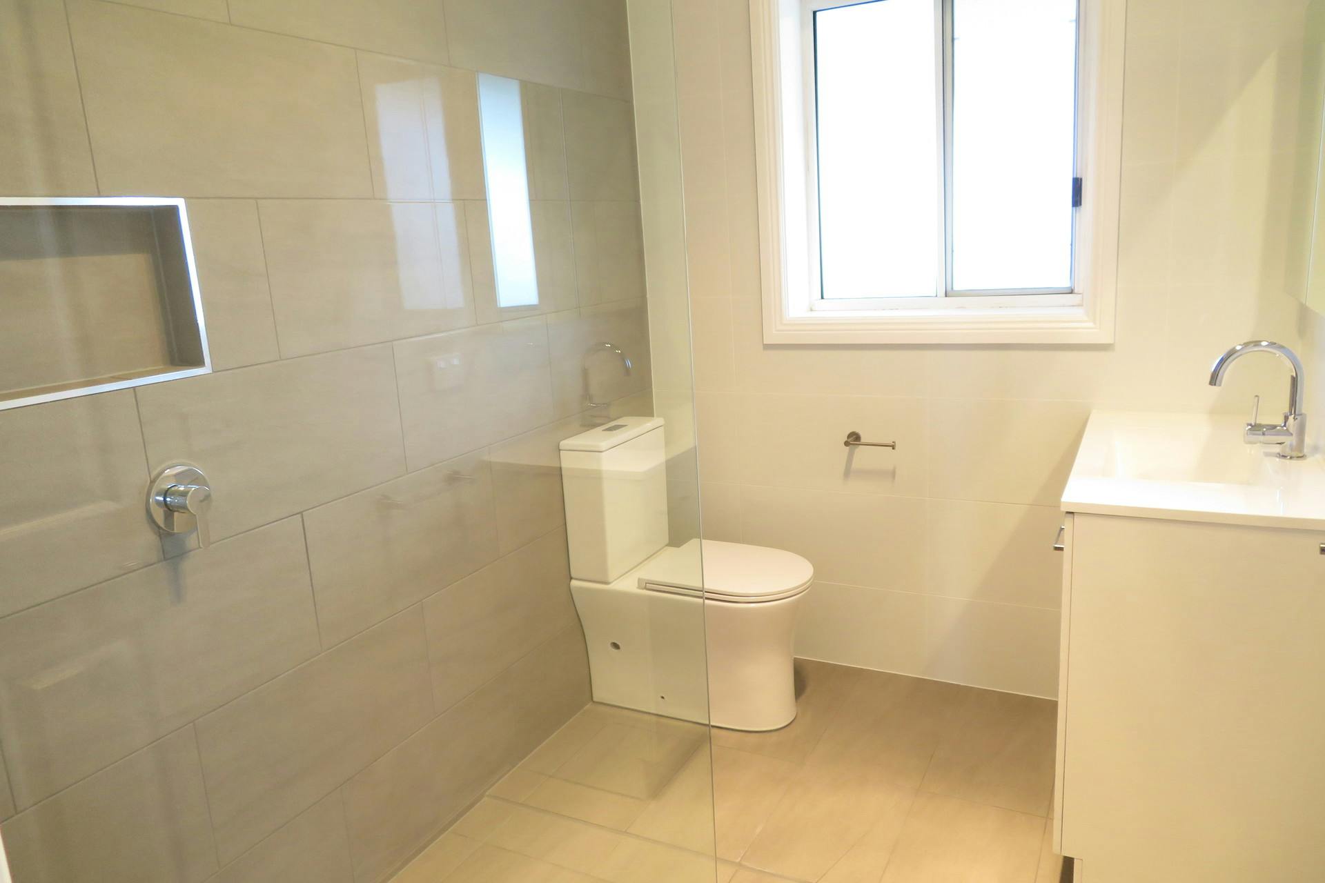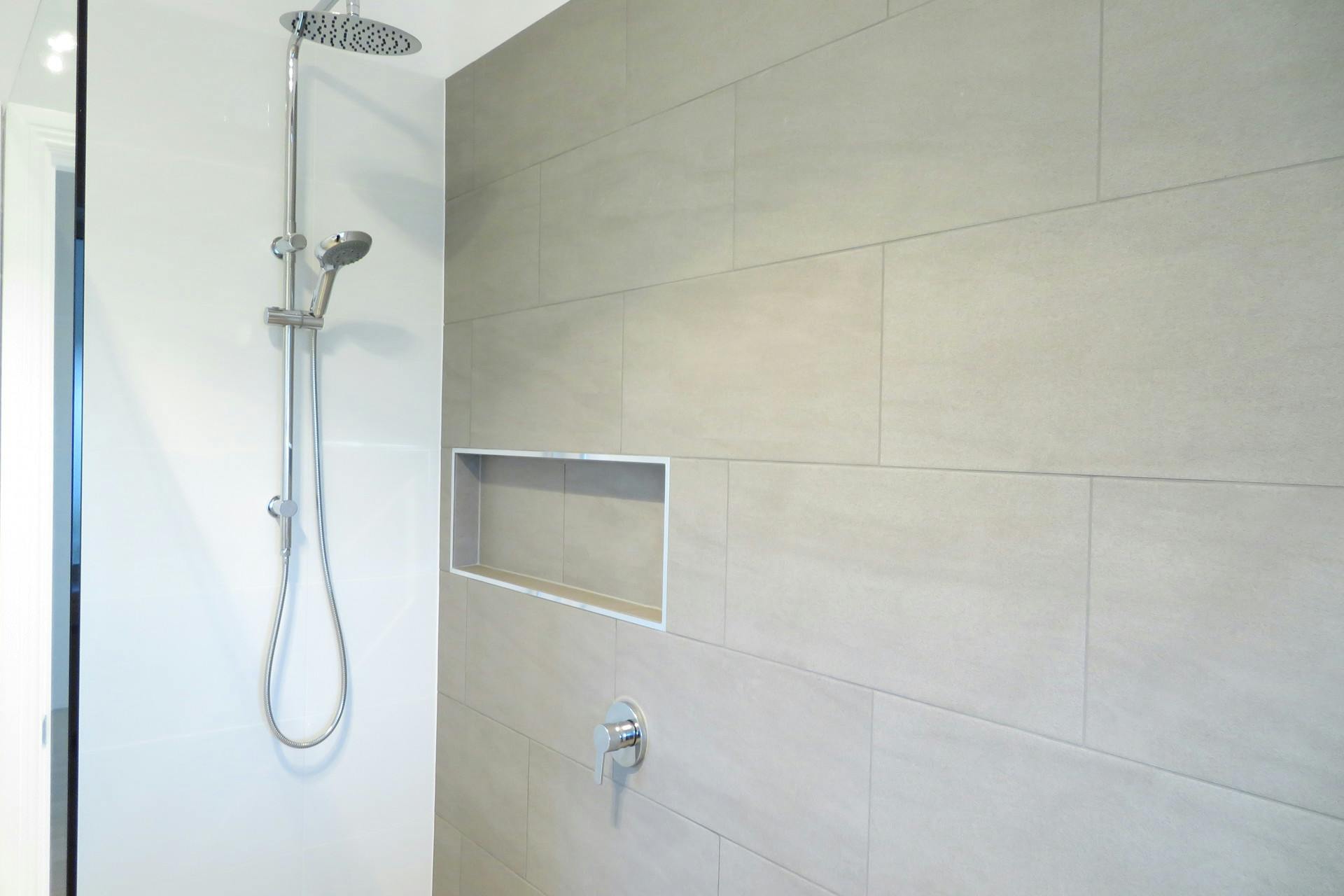✨ Luxurious bathroom featuring easy access into the shower with a refreshing rainwater showerhead